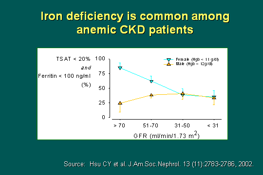 - Hsu CY, McCulloch CE, Curhan GC. Iron status and hemoglobin level in chronic renal insufficiency J Am Soc Nephrol. 2002 Nov;13(11):2783-6.