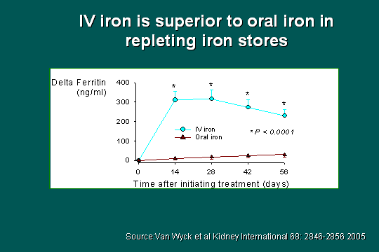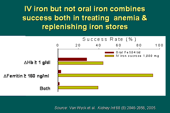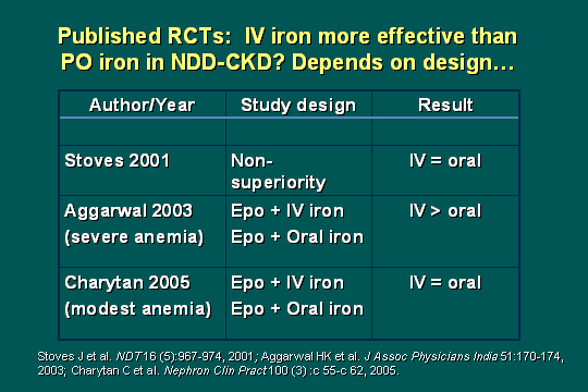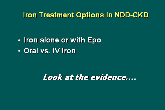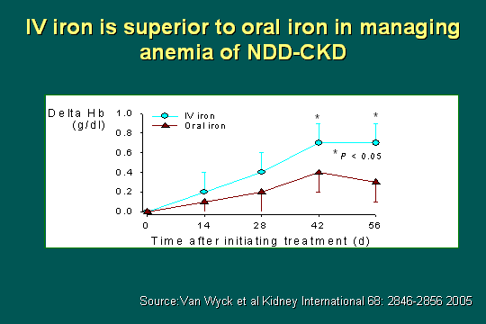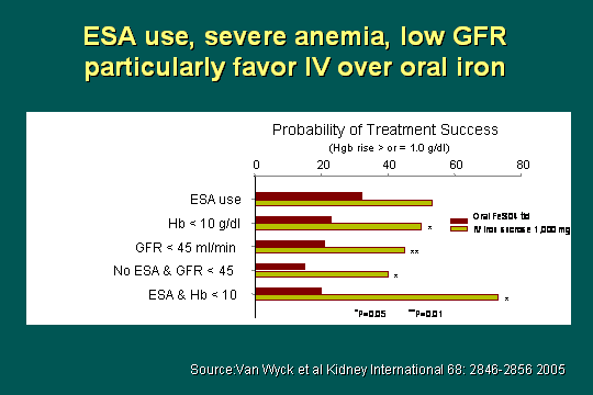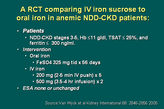 Dr. Van Wyck published this study a few months ago in Kidney International. Basically he took a new approach and did a randomized trial comparing IV to oral iron, and he looked at oral iron for 6 weeks with ferrous sulfate 325 mg 3 times per day and IV iron either by 200 mg push or by an infusion of 500 mg over 3-1/2 to 4 hours. The patients were rigidly controlled; they had to be in stage 3 to 5, hemoglobins had to be less than 11, TSATs less than 25, and ferritin less than 300. What was different in this study from the others that helped control for variables is, that these patients either had no EPO, or the EPO was not changed during the 6 weeks' time, and the evidence was much more clear and, I think, answers the question.