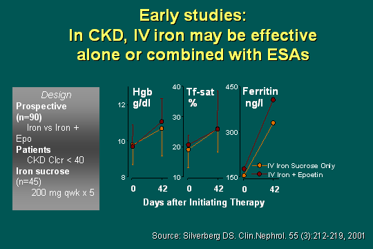 The early studies and this study by Silverberg some years ago in 2001 is a little complicated, but if you look at the light line, that is iron sucrose only, and the darker line on top of each slide is IV iron plus EPO. At that time, this was a 6-week study, about 42 days, looking at the hemoglobin between 8 and 12, there was unquestionably a significant rise in all targets - hemoglobin, iron saturation, and ferritin. If you read the paper further, one-third of these patients with iron sucrose only, needed no EPO. I think that is a very important point that we need to point out in the chronic kidney disease clinic, given the difficulties we have in coming up with ESA agents, and Betsy will tell you more about that.