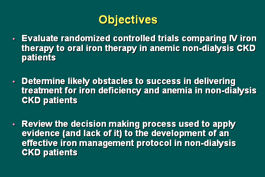 These are objectives, and I will go over the trials, particularly looking at oral iron therapy versus IV, and Betsy will review the obstacles to success and protocol development.
