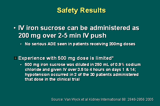 - Van Wyck DB, Roppolo M, Martinez CO, Mazey RM, McMurray S; for the United States Iron Sucrose (Venofer) Clinical Trials Group. A randomized, controlled trial comparing IV iron sucrose to oral iron in anemic patients with nondialysis-dependent CKD. Kidney Int. 2005 Dec;68(6):2846-56.