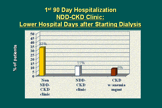 Here you can look at first 90-day hospitalization, and the percent of patients, on the vertical axis, as a function of whether they were patients in our clinic or not in our clinic, and whether or not they had anemia management; you can see that 33% of this garden variety of people who were started on dialysis had hospital days, compared to 11% if they actually came to our CKD clinic; and if you add treatment of anemia in any way you want to define it, we were down to 8%. So there is a four-fold decrease in the first 90-day hospitalization and for the acuity of problems that we see, I think that is a real remarkable outcome, and we are very proud of that.