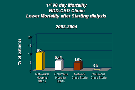 As far as mortality, which is the bottom line here - can we save lives with this approach? If you look at what our outcomes were by site, whether we had seen the patients and compared them to Network (clinic versus hospital), you see in the first yellow bar that Network Hospital starts had about a 9% overall mortality. In our hospital starts, we did a little better, 5.4%, and we think that is because we have been out talking about this, and we had less of it. We actually decreased hospital starts about 75% during this period of time. If you look at the Network Clinic starts, mortality is about 4.6%, and if you look at our Columbus Clinic starts - the patients that we followed in the CKD Clinic - at the end of this 3-year study we did not have a death. We are very excited about that. It gives us lots of energy to go on and push this program outside the dialysis unit and our own practice.