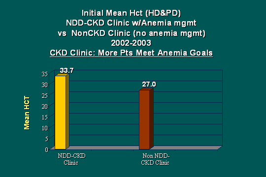 Now you say what is in this for the anemia managers? And how excited they are about this in our PD and our hemo units! If you look at the mean hematocrit in the CKD clinic, the patients that we saw, the mean was 33.7% and for those that we did not see, it was 27%. Why? Does that make a difference, bringing somebody in that well and how well do we know that anemia is such a marker of hospitalization rate and marker of mortality? So our anemia managers were very excited when we began to send in patients that had these kind of numbers.