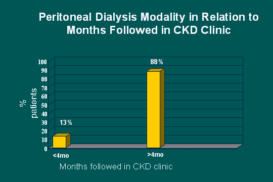 As far as PD, do we have PD nurses here today? Great. This is a slide that again I take a lot of pride in but I have to give the credit to this lady on the right. The choice of PD modality relating to the number of months we have followed them, and you see in the first bar, the low bar, 13%. If we did not see a patient for more than 4 months, we had little chance of impacting their modality, whereas more than 4 months, 88% chose peritoneal dialysis. How many actually went to PD - is it in the 50% range? And these numbers conflict rather significantly with published data of 50% and 35%, but I will tell you what my assessment of this is.First of all I believe that these patients saw us long enough even though 4 months does not seem like very long. If you have things done to them, you make them feel better and if you think about those uremic patients that we see in the hospital, I am not sure they are thinking well enough to know what we are talking about. With correction of anemia, we carry more oxygen into the brain. I propose that they can more clearly make a decision. Then I think after they feel better, they develop a trust with the whole team and more Betsy than me because she spends more time with them and really develops that relationship that it takes to lead a patient to do what you think is best for them and for them to have that opinion. So our PD nurses have been very happy with this.