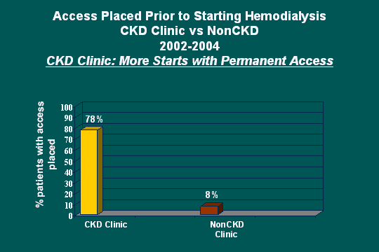 As far as the hemo nurse, I think this is the really big slide, access placed prior to starting dialysis. About 78% of the patients in this study were able to go to hemo with an access in place, and we are very proud of that and as you can see with people that did not come to clinic, we still got a few accesses in but not near what we did in the clinic outcome. You might say what does this have to do with anemia? This is just a spinoff. This is another outcome that related to the overall program that we have.