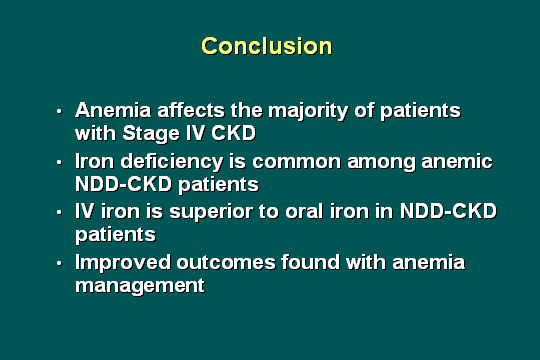 In conclusion, anemia does affect the majority of patients in stage 4 CKD, iron deficiency is very common, and IV iron is superior to oral iron in this predialysis group of patients and from our own clinic slides, you can see the improved outcomes are seen with anemia management and all the things that it let us to be able to do while we followed these patients. I will turn it over to Betsy now, and she will tell you more about how we made this happen and developed a protocol.