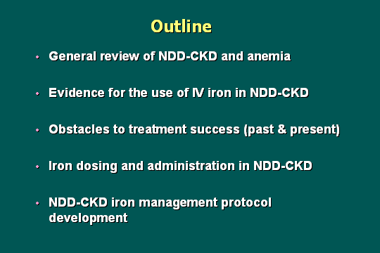 First I will have a general review of non-dialysis-dependent CKD patients and anemia, and then we will get into the use of IV iron in this population.