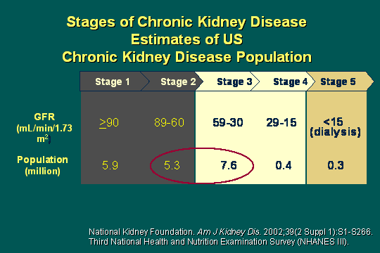 For stage 1, that is, someone with very minimal disease with GFR over 90, there are about 6 million people in that group. For stage 2, GFRs are 60-89, just about 5 million people in that group. For stage 3, where GFR is 30 to 59, there are about 7.6 million people. Note the big change to stage 4 - 400,000 people with GFR 15-29 and look at stage 5, which are the patients I assume most of you are seeing in dialysis units, with GFR under 15, only 300,000 to 360,000, I think, is the number today. So the big question is, what is happening to stage 4 and 5 patients?
