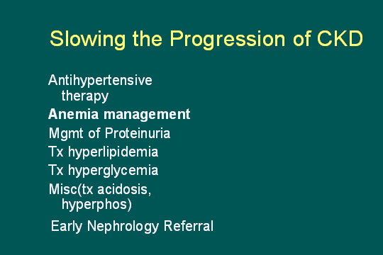This is a slide that I have put in at the last minute because I like in the CKD talks with my referring physicians, to think about what is it that I can do to slow the progression of chronic kidney disease as a whole and no question the top 3 are our big targets, antihypertensive therapy, management of the anemia, and proteinuria. We will look at anemia today as a very important risk factor in slowing the disease process and for all these we do have very good data. We will look at the biggest problem with early referral and that is being able to get the patient and we could talk all day on that, but I will just say that is one of the challenges that we all have in nephrology - getting to that patient in time to do something for him, so he may not need to come from the hospital to the dialysis facility.