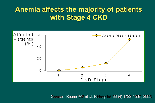 How prevalent is anemia in stage 4 CKD? You can see that by percent affected by stage; clearly, with hemoglobin less than 12, more than half the patients in stage 4 are affected by anemia.