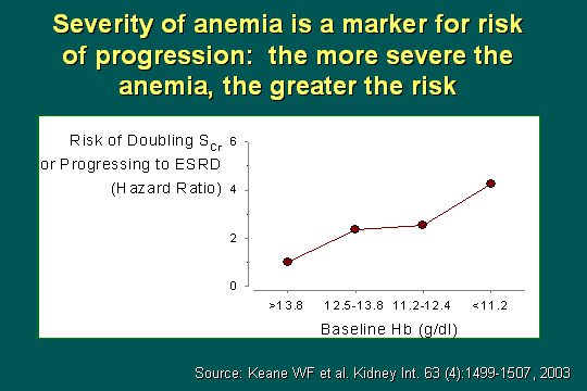 How does severity rank as a marker for risk of progression? If you look at the baseline hemoglobin, as it worsens from 13.8 to 11.2 on the right and you plot that against the risk of doubling of the creatinine, which was pointed out in the RENAAL study several years ago, but it is still very important data, there is a very linear relationship; and if you look at the patient with a Hb less than 11.2 and follow that up and over to a hazard ratio of the risk of doubling (the serum creatinine), there is a 4 times greater chance of progressing to ESRD when the hemoglobin is less than 11.2.
