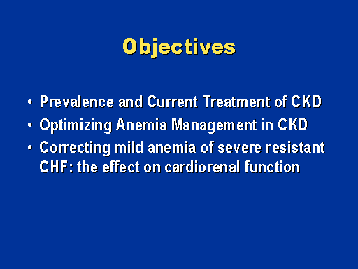 The objectives of this evening's program are threefold: prevalence and current treatment of chronic kidney disease, optimizing anemia management in patients with chronic kidney disease, and then this very vexing issue about correcting mild anemia in severe resistant CHF and showing how this has an important impact on cardiorenal function. To introduce the first speaker, Dr. Kimmel is going to come back to the microphone.