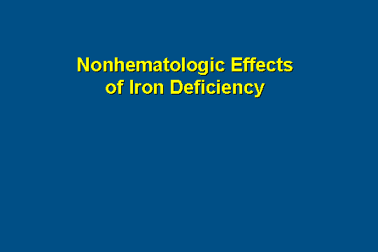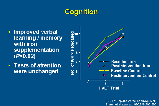 When we can look at some of the nonhematologic effects of iron, one of the interesting early studies, and this was from Johns Hopkins published in the Lancet, they looked at teenage girls for the most part who were iron deficient, and iron deficiency is very common in young women and particularly in the teenage years as people are growing fast and starting to menstruate, and they found that there was a decrease in cognition, in learning, memory, and that when they treated with iron before the hemoglobin level rose at all, as they treated the iron deficiency, that the girls' ability to think more clearly, to remember, and to learn were all improved. So iron plays an important role in cognition and in learning.