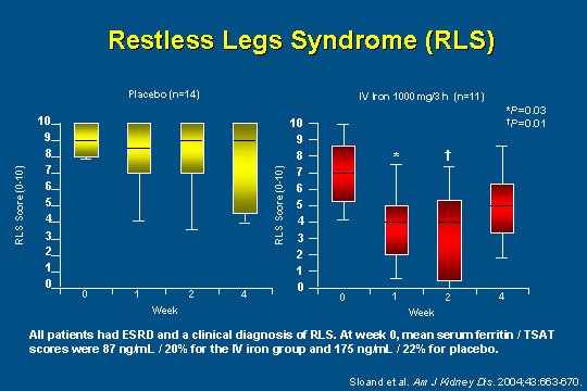 - Sloand JA, Shelly MA, Feigin A, Bernstein P, Monk RD. A double-blind, placebo-controlled trial of intravenous iron dextran therapy in patients with ESRD and restless legs syndrome. Am J Kidney Dis. 2004 Apr;43(4):663-70.