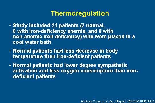 - Martinez-Torres C, Cubeddu L, Dillmann E, Brengelmann GL, Leets I, Layrisse M, Johnson DG, Finch C. Effect of exposure to low temperature on normal and iron-deficient subjects. Am J Physiol. 1984 Mar;246(3 Pt 2):R380-3.