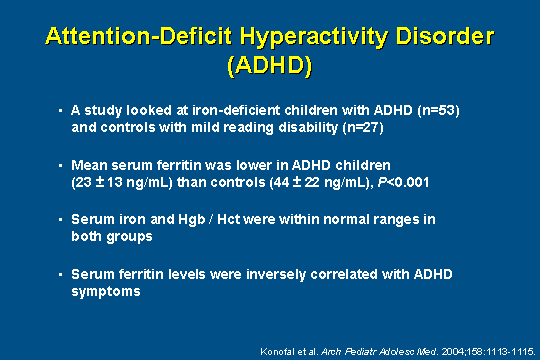 Interestingly, attention-deficit hyperactivity disorder (ADHD) seems also to have a link, to some extent, with iron status. Ferritin values are lower in children with attention-deficit disorder than they are in control children, suggesting at least the possibility that in children with ADHD that iron deficiency might be an important point that regulates - so that is an introduction.