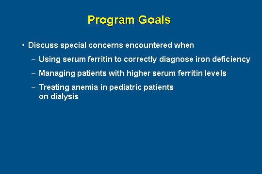 The goals of today's program: I will speak first and then Dr. Warady will speak after me. At the end, we will have a question and answer session. Again, as you have your questions, please do write them down on your Q and A cards, and they will be collected from you at the end of each of the lectures. Our program goals are to discuss some very special concerns - one of them regards serum ferritin and how we use it when the numbers tend to be on the high side. Managing patients with higher serum ferritin values, when do you treat with intravenous iron and when do you not treat these patients, and then we will look at this interesting and special population of the pediatric patients with kidney disease.