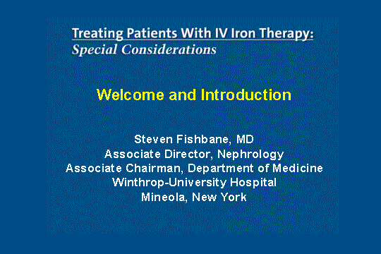 I would like to welcome you and thank you all very much for coming out this early in the morning. In today's program, we will be speaking about a number of issues that pertain specifically to iron treatment. My name is Steven Fishbane. I am the Associate Director of Nephrology at Winthrop-University Hospital in New York. I am a member of the KDOQI Anemia Workgroup that is currently writing the new KDOQI anemia guidelines that will be published sometime early in 2006.