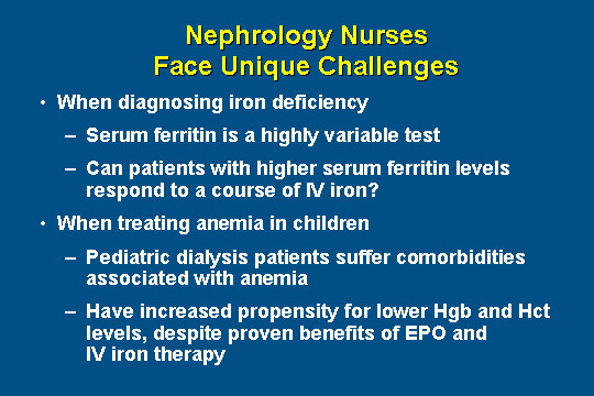 We will begin today's presentation by talking about some of the factors that frame today's 2 lectures. In the diagnosis of iron deficiency, one of the challenges that nurses and physicians face is that serum ferritin is a highly variable test, and there are going to be many patients that have relatively high levels of serum ferritin, and we always have the following question, don't we: What you do when the transferrin saturation is relatively low but the serum ferritin value is high? We will talk about that. When treating anemia in children, pediatric dialysis patients suffer complications related to anemia treatment that are particularly important, and they have an increased risk for lower hemoglobin and hematocrit levels, and in Dr. Warady's lecture today, he will speak more regarding this important patient population.