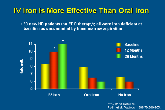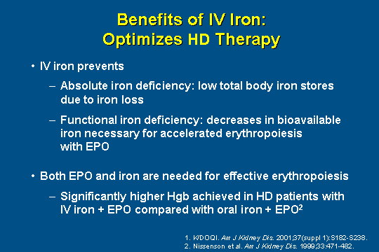 What are the benefits of intravenous iron treatment? Without intravenous iron, absolute iron deficiency develops in most hemodialysis patients. If you do not treat with intravenous iron, patients will, for the most part, tend to become severely iron deficient. Functional iron deficiency, which we will speak about a bit more later, happens as well, but it is very clear that both erythropoietin and iron are important components of successful and adequate anemia treatment.