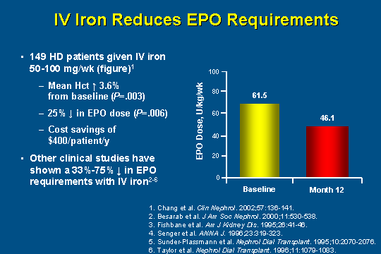 - Chang CH, Chang CC, Chiang SS. Reduction in erythropoietin doses by the use of chronic intravenous iron supplementation in iron-replete hemodialysis patients. Clin Nephrol. 2002 Feb;57(2):136-41.
