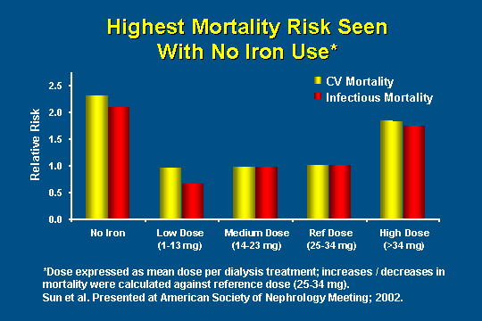 This is an interesting study that was presented a couple of years ago at ASN by Sun et al. and what they did is look at the risk of death for patients in relationship to the amount of iron that they were treated with. In the first group of vertical bars, you will see that the absolute highest risk of death was in patients who were treated with no iron at all, and it would make sense that if you do not treat with one of the body's most important molecules and allow people to be severely iron deficient, that you are going to hurt function of key tissues and organs throughout the body.