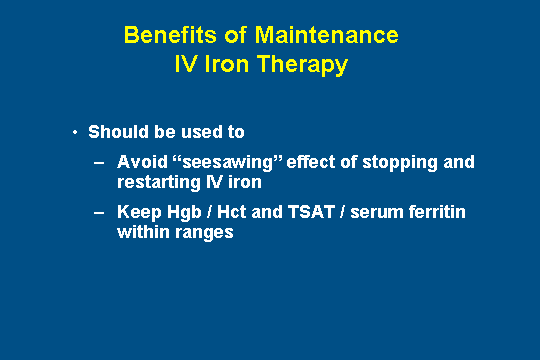 Maintenance iron: You can give intravenous iron in 2 ways. You could test every 3 months, and then if iron deficient, you can give a large dose like we typically do, 125 mg for 8 consecutive treatments, and that tends to be called a repletive strategy for iron treatments. The alternative is maintenance therapy. Simply giving weekly doses of intravenous iron in order to anticipate the fact that most dialysis patients become iron deficient, and maintenance iron therapy avoids the seesawing of starting and stopping iron treatment, which is probably not biologically the best way to give treatment, and it tends to keep hemoglobin, TSAT, and ferritin within the target ranges.