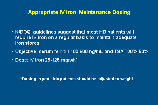 K/DOQI guidelines suggest that most hemodialysis patients will require treatment with intravenous iron on a regular basis. That comes from the 2001 guidelines, and the objective of treatment is to achieve a serum ferritin of 100 to 800, and a transferrin saturation of 20% to 50% with weekly dosing of intravenous iron.