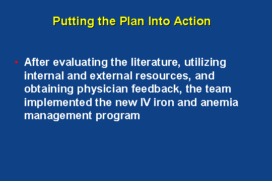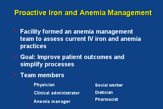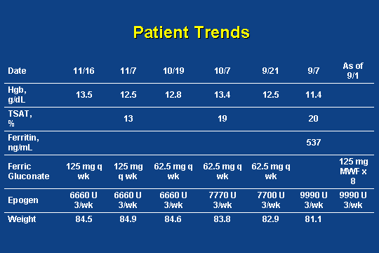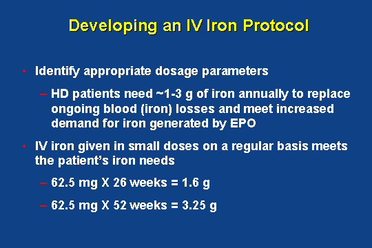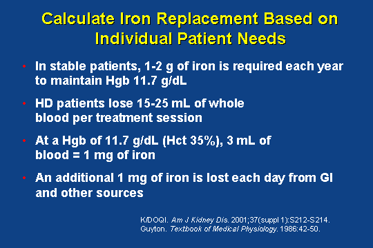 After 2004, goals for 2005 - we found we had quite a few patients, once they started getting iron routinely, their hemoglobin would be 11 and all of a sudden it would be up to 14. Now, especially with the new guidelines, the new reimbursement, we are looking at ways to cut back the EPO and/or the iron dose a lot sooner before they soar up into that high range. Someone going from 11 to 12.3, which is in range within 1 month, we would start cutting the dose back already because in the next month, they are going to be 13.5 or 14. We are also looking at estimating the iron needs of patients, especially new patients to go from 8 to 11 just giving them enough iron for that process plus giving them enough iron to offset the losses that they have during dialysis. This just reiterates iron replacement in an average dialysis patient. Stable patients stabilize between 1 and 2 g of iron per year. They use roughly 15 to 25 mL of whole blood per treatment session and that is without any adverse events, their needles falling out, dialyzer clotting, whatever. At a hemoglobin of 11.7 or hematocrit of 35%, 3 mL of blood equals 1 mg of iron and to just show, 1 mg of iron is lost each day through the GI tract. In order to estimate their iron needs, you need to remember all the iron losses that can occur in a dialysis patient.