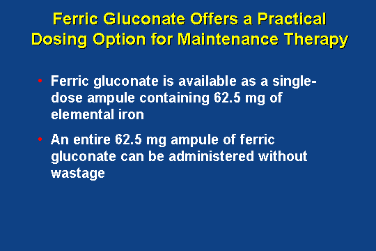 Ferric gluconate is available as a 62.5-mg ampule of iron and it offers a practical dosing option for therapy. You can give the entire amp at one time rather than giving part of it and throwing it away and you know how nurses hate to waste anything, so it is important to us that we could use the entire vial and did not have to waste anything.