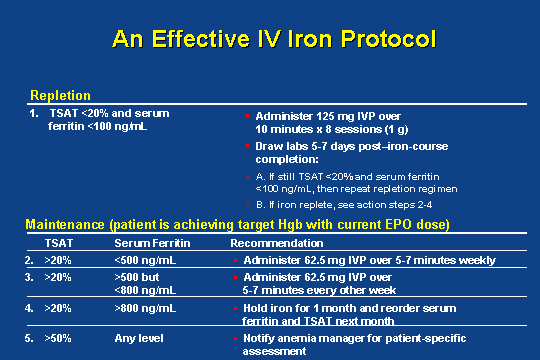 This slide just shows our basic iron protocol. This is also on the website that I mentioned before. The first section includes repletion and that is the iron that you give as a bolus, 125 mg x8 doses, which equals 1 g. Iron depletion is considered a TSAT of less than 20 and a ferritin of less than 100. The bottom part of the slide is how we do maintenance dosing, and these are only in patients with hemoglobins that are already over 11.
