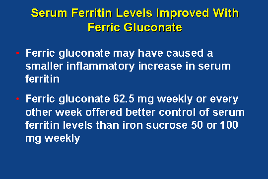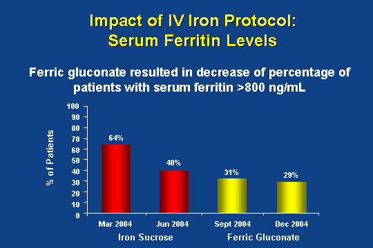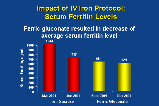 Several reasons that we felt why our serum ferritin levels have improved. In a 2002 study by Zager and Agarwal, they felt that ferric gluconate caused a small inflammatory response leading to reduced ferritin level. Also giving ferric gluconate 62.5 mg per week or every other week offered better control of serum ferritin levels than us giving iron sucrose, and we were giving 50 to 100 mg per week.