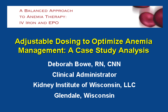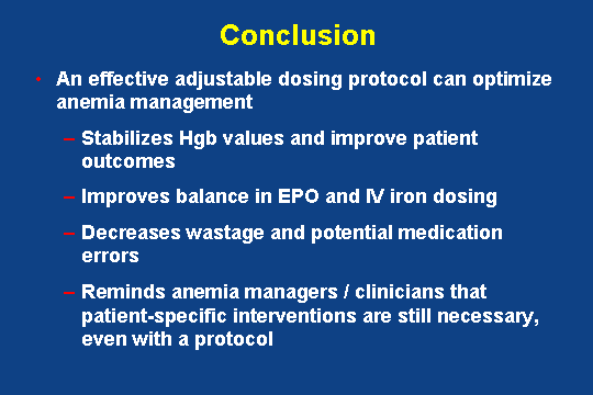 In conclusion, an effective adjustable dosing protocol can optimize anemia management. You can stabilize your hemoglobin values and improve patient outcome, improve the balance of EPO and iron dosing, which is very important, decrease wastage of drug and potential medication errors, and remind the anemia managers and clinicians that patient-specific interventions are still needed. Each patient needs to be looked at as an individual and by utilizing the different assessment tools, it will take you through the process of what you need to look at to see where the patient is at. You also need to remember that you continually have to look at your numbers. If all of a sudden, for the last 2 years, 84% of your patients have had a hemoglobin greater than 11, what about the other 16% who are out there. You have to keep looking at the reasons and the reasons can change. We were looking at ferritins 2 years ago and now we are looking at how much IV iron we give, how much iron they use, and trying not to overshoot the top of the goal. You have to keep looking at your outcomes, you might still have the same percentage of patients in that range, but the reasons for that are going to be changing. You need to constantly look at that and that is the true definition of CQI.
