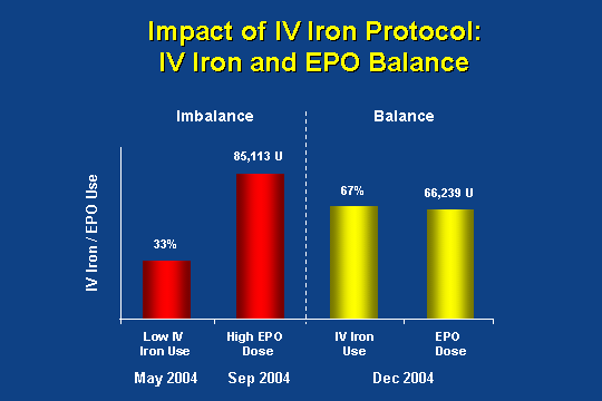 This slide shows our balance. When we first started out, only 33% of our patients were receiving IV iron because the iron was being held, because their ferritin level was so high. In September, we reached a high EPO dose of 83,000 units on average. Once we hit that peak, then we balanced off in December of that year. 67% of our patients were on IV iron and our average EPO dose dropped from 85,000 to 66,000.