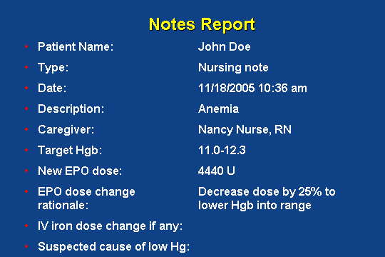 This next slide will show, this is a note that we use for charting. The note report. It is a template. You could fill in the blanks. Patient name, type of note, the date, description of what the note, is anemia, who the person is, we always list our target hemoglobin level, whatever the EPO dose is that has changed, the rationale for changing it. If you change your iron dose, you could list that, and then there is a place to put the suspected cause of low hemoglobin. This information is very important to justify your EPO and iron dosing and to get correct reimbursement. This information is probably going to change on our notes along with once the new K/DOQI anemia guidelines come out. They are going to be released this spring at the NKF Spring Clinical in Chicago and it is going to be very important that you show 25% decrease in EPO dosing if the patient's hemoglobin gets over 13. If you choose not to decrease your dosing by 25%, Medicare will choose to pay you 25% less.