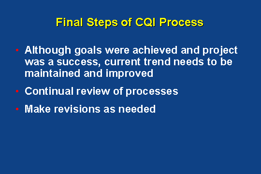 The final step of the process is to revise the plan as necessary. We concluded our goals were achieved. We did get patients' ferritins down under 800 but the CQI process requires that you are always looking at the trends and always maintaining, trying to keep your trend and to improve it. In order to do this, you need to always keep reviewing your processes and make decisions as needed.
