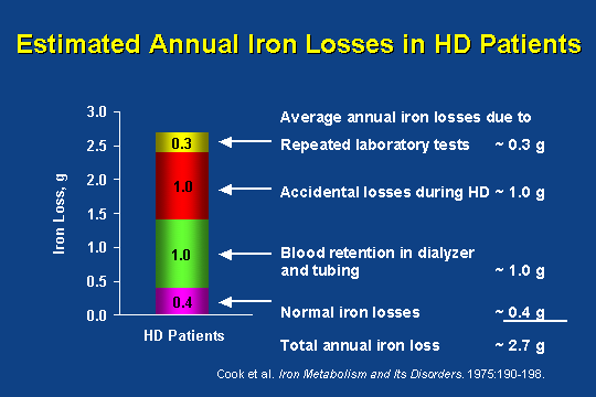 This is a slide that Andrea showed also. It just gives you an idea, a picture of you of how much iron and why the patients lose iron. There is normal iron losses, blood retained in the dialyzer, accidental losses, needle falls out, clotted dialyzer. Some people have a lot of lab tests drawn, for PTH, for pro times, hemoglobins. There are always some tests they want, a PSA, and so they do have a lot of blood draws done monthly also.