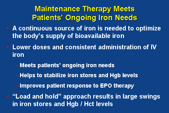 Maintenance therapy meets the patient's ongoing iron needs. A continuous source of iron is needed to optimize the body's supply of iron so you can continually make red blood cells. You need to look at the patient's needs, what they need, and to make sure you give enough iron to bring them up if they are below 11, to give enough iron to go from 8 or 9 up to 11. By adhering to a maintenance treatment, by giving so much every week or every other week rather than loading, giving them 1 g, stopping, waiting to see what happens, giving them another gram, it is much easier to give a continual low dose of iron. Loading and holding also involves having to write orders to start the drug, stop the drug, do it over and over, and with the small weekly dose of iron, this extra task of writing those orders is eliminated.