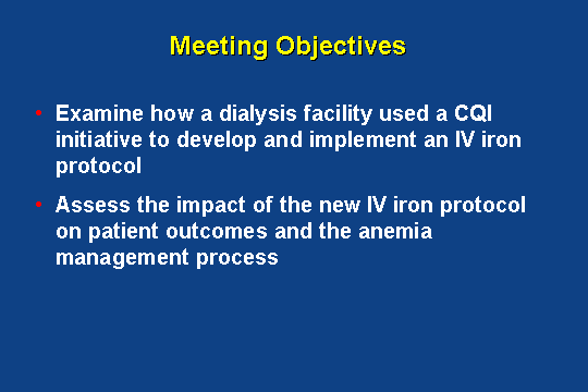 ...are to examine how a dialysis facility used a CQI initiative to develop and implement an IV iron protocol. We are also going to assess the impact of our new IV iron protocol within our unit and I am just going to be talking about our unit and how we developed a protocol.