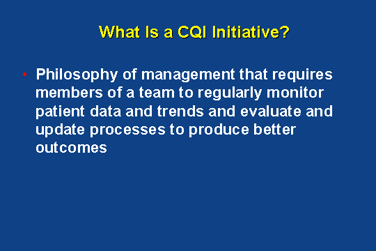 First of all, what is a CQI initiative? It is a philosophy of management that requires members of a team to regularly monitor patient data and trends and to evaluate and update processes to produce better outcomes. Some of the key strategies are to organize a team, benchmark your current processes, see where you are at, identify opportunities for improvement, implement a plan, evaluate the results, and to revise the plan as necessary. And I know all of you went to nursing school and remember the nursing process and it is the exact same thing. In a nurse-driven CQI process, the nurse manages the activities and movements of the CQI initiative and we have involved the physicians in progress updates and in approval of changes.
