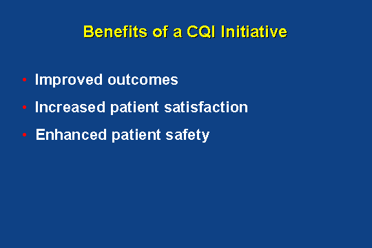 There are several benefits of a CQI initiative. One benefit is improved outcomes. A program allows you to look at your poor responders, see whether or not they are responding. It may include, you need to switch your IV iron to look at patient labs differently. Another benefit is increased patient satisfaction. As patients reach their target hemoglobin, they are going to be feeling better, they are going to be in the hospital less, they are going to have more energy, and these improvements in patient well being will result in enhanced patient satisfaction with the overall hemodialysis experience and more confidence in the healthcare team. Another benefit is enhanced safety. A CQI program can prevent deviations from standard practices in dosing the iron and the Epogen and in a busy dialysis unit, there is always that chance of a mistake, so the fewer times that you are changing a dose, the less chance of error.