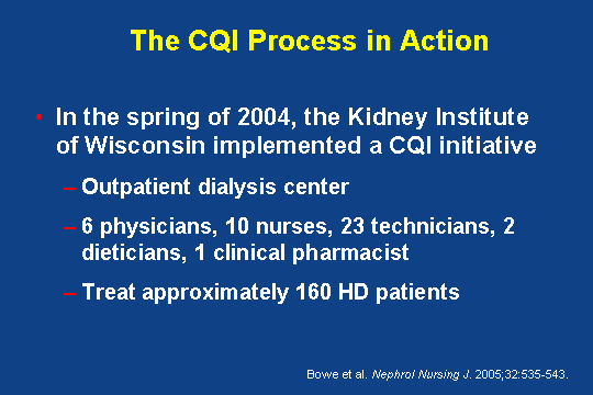 In the spring of 2004, the Kidney Institute of Wisconsin started a CQI initiative. We are currently an outpatient dialysis unit with 28 stations. At the time we started this study, we had about 75 patients and now we have around 160 patients. We have 6 physicians, 10 nurses, 23 technicians, 2 dietitians and social workers, and a pharmacist.