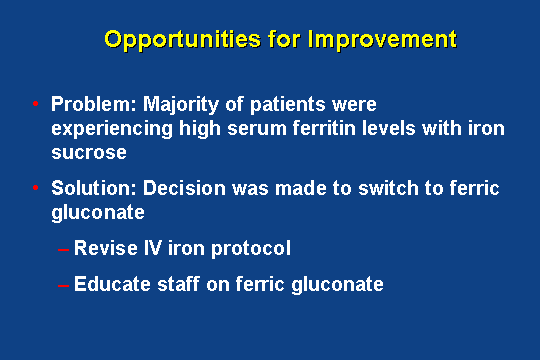 Opportunities for improvement - the majority of our patients were experiencing high ferritin levels. Most of our patients had ferritin levels over 800, so we wanted to look at the reason for that. Using that process, we looked at our current IV iron environment and found opportunities for improvement. We consulted various personnel, reviewed current literature, and then we decided to switch from iron sucrose, which we were using to sodium ferric gluconate. Because we were changing interventions, we decided it was very important to educate the staff. We had people from the iron company come and give in-services to the staff, which includes the nurses, techs, dietitians, social workers. Those people were also part of the team and they each brought a little bit different perspective of anemia to the group.