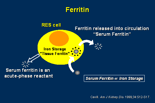 Ferritin. In the perfect world, which our patients do not live in, when iron goes into storage, a serum ferritin comes out, so the iron goes in and tissue ferritin is very, very rich in iron and into circulation comes the serum ferritin. Also, for a lot of reasons, anytime there is infection or inflammation, more serum ferritin comes in. If patients have poor clearances of serum ferritin or if they have liver disease, you are going to have even higher serum ferritins, so when you are looking at ferritins and adjusting for what is going on, you really have to look and see what is the history. Is there something hidden or missing? Have I missed tweaking a dose of iron or is there more to the story? And frequently, there is more to the story.