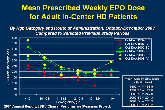 Let us stop and think about what we are doing in our units. I do not know how often you all get hemoglobins but we get them at least twice a month, and if someone is out of range, we get them weekly. I tell the anemia managers in our unit to just keep a ruler on their desk and if they have changed their EPO dose within the last month, and they want to change it again, just to hit themselves over the knuckles with that ruler and stop. You may have to pad the ruler for if the physician comes back and wants to change the EPO dose. I cannot tell you that I never change the dose because I am not consistent to never or always do almost anything. If I have a good reason, I might, but we get so busy that it is important that you look back and see when the dose was last changed, because you can see from this that if you have made a change within the last 2 weeks for instance, you have not seen the result of your change. If you change it again now, you are kind of just like that dog chasing its tail. You are not going to know what is going on. You need to trend the Hb levels, and if something really bad happens, to adjust to it; but most of the times one just is trending data and to make sure things are going on, except when you have the EPO dose on hold. As soon as you start seeing patients' Hb levels start trending down, if you wait until the Hb gets close to 11, and it was 13, you may be too late (to prevent a drop below 11). As I start seeing patients trend down, I restart the EPO and then kind of watch. That is a little bit about trending Hb levels fits in, and how important this is.