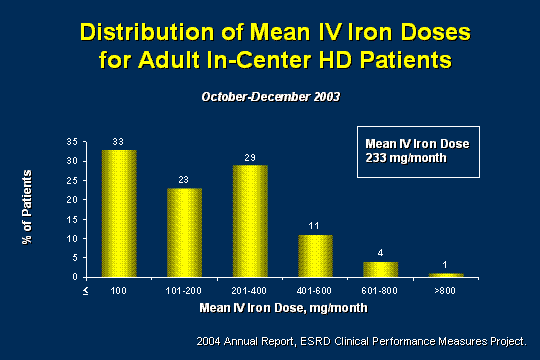 This is the data again from 2004 and look at those patients: We had a third of the patients who were getting less than 100 mg of iron a month. If you are looking at 2.5 g per year iron loss, or in that neighborhood, you are looking at losses of 250 to 270 mg a month. You have well over 50% of your patients who are getting less than 200 mg of iron a month. If that is the case, you need to think, hmm why? This patient, by my protocol, or whatever you are going by, is not on that much iron. Should they be? Are we missing the boat to balance the iron and the EPO? Then, those higher doses are probably patients who replete, and I will tell you that even though I do not replete, I do that because I am getting old, I am just not smart enough to remember to start something after 8 or 10 doses. If you are looking at iron on a monthly basis, then what I would like to do is I just generally start out at 125 mg twice a week. In a month, I have given the dose that usually is a repletion dose and it is time to look and see where they are at. For some people most of the time you have to tweak it down at that point, but some people need a little bit more. You have to come into a different mindset on what you are doing and how you are doing it.