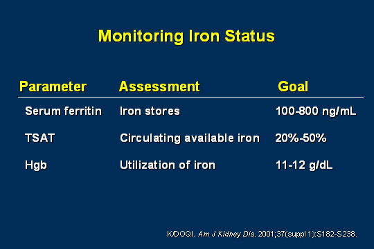 - Besarab A, Amin N, Ahsan M, Vogel SE, Zazuwa G, Frinak S, Zazra JJ, Anandan JV, Gupta A. Optimization of epoetin therapy with intravenous iron therapy in hemodialysis patients. J Am Soc Nephrol. 2000 Mar;11(3):530-8.
