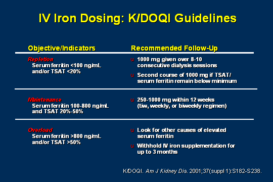 - Hudson JQ, Comstock TJ. Considerations for optimal iron use for anemia due to chronic kidney disease. Clin Ther. 2001 Oct;23(10):1637-71.