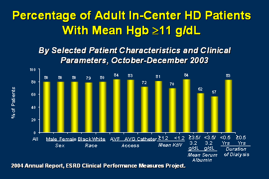 I love this slide. This data is freely available to us, and we have gotten a little better in some of our areas but let us talk about this from an overall patient standpoint. Where are our problem areas? You need to know these in your units, and you can think about this right now. Where are my problem areas and who are these patients who I am dealing with? If you look across the first bar that is really a dip, here are catheter patients. I could tell you those catheter patients are my new patients, my sicker patients, my malnourished patients, but those patients usually fall below target. What can I do to bring them up? Are they that way because their ferritins are high and we are frequently holding? Should I go to whoever your prescriber is if you are fortunate enough to have an APN because of all the nephrology nurses, I think we APNs really can be such an asset to your unit because most of us are just freely available to you. Look at the Kt/V. The patients who have low Kt/V are the next ones who do not meet targets as well, 70%. Are those your catheter patients? Are those your patients who chronically cut their treatment short? What is going on there? What can you do to increase adequacy because we know that if you increase adequacy, your outcomes will be better. Look at serum albumin, 62% when the serum albumins are low. Remember that those are proteins that we are looking at that our transferrin saturation is based on. If they are malnourished, those indices you are looking at are not true and perhaps they may need a deeper assessment than what we are giving... and obviously, those patients who have been on therapy for a short amount of time. If you actually collect that data and show your doctor those outcomes, maybe you can entice them to start an anemia management clinic in their offices.